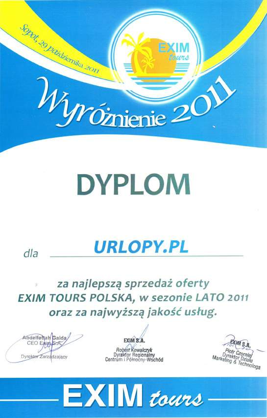 Dyplom dla Urlopy.pl za najlepszą sprzedaż oferty EXIM TOURS POLSKA, w sezonie LATO 2011 oraz za najwyższą jakość usług.