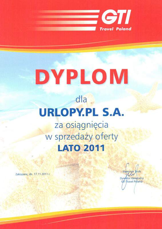 Dyplom dla Urlopy.pl za osiągnięcia w sprzedaży oferty Lato 2011.