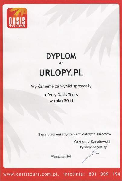 Dyplom dla Urlopy.pl - wyróżnienie za wyniki sprzedaży oferty Oasis Tours w 2011 roku