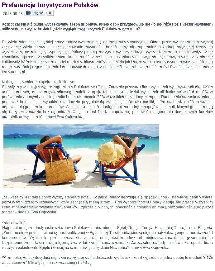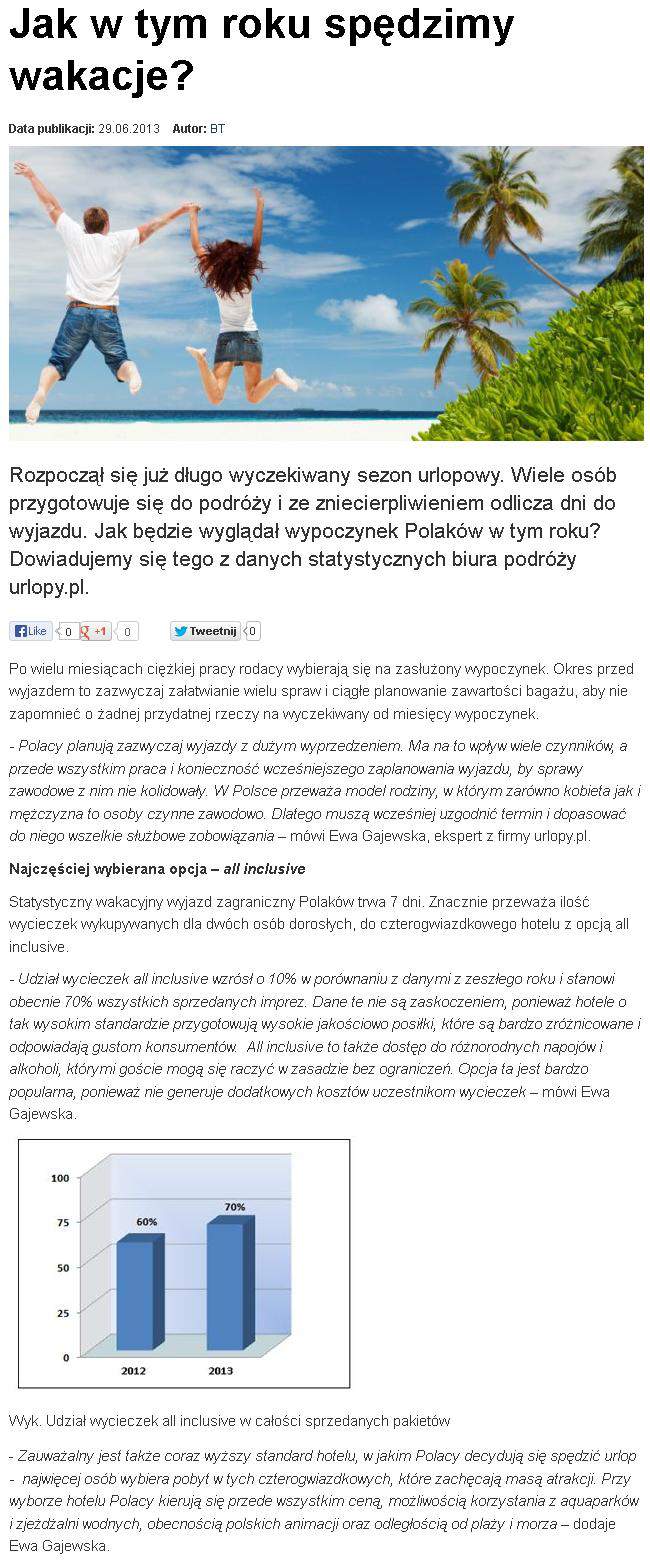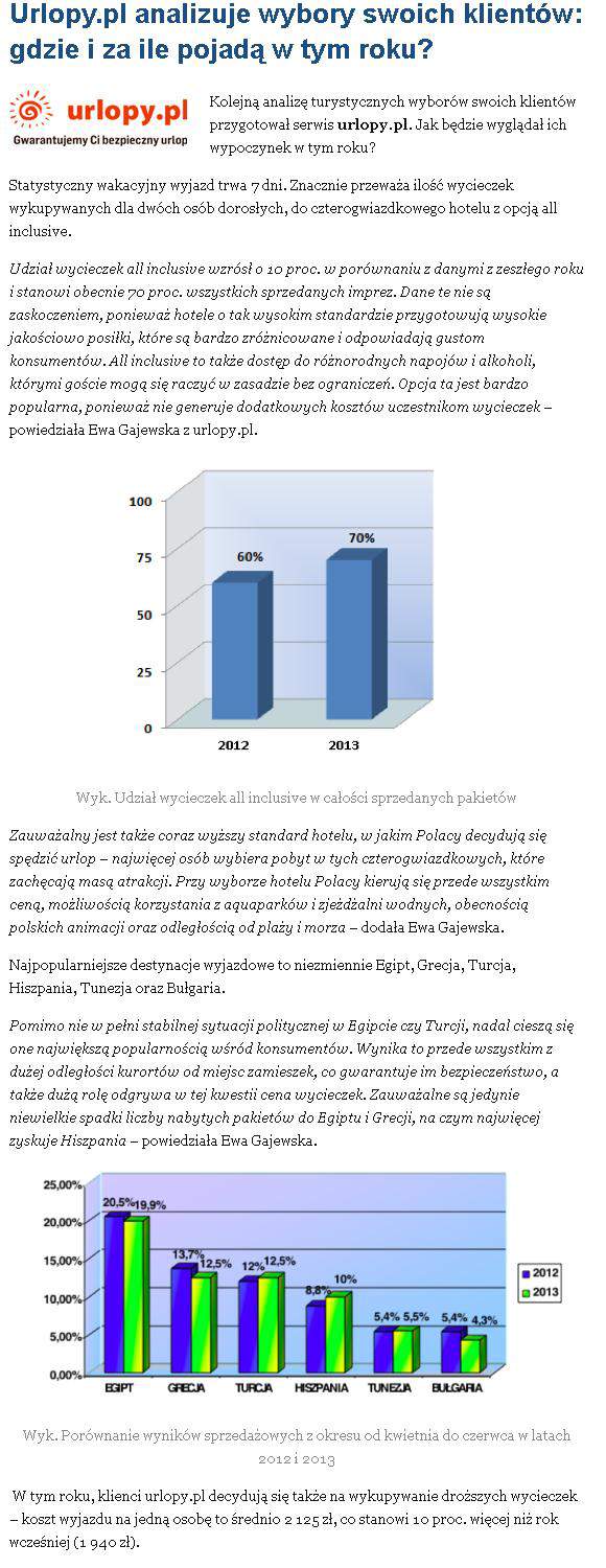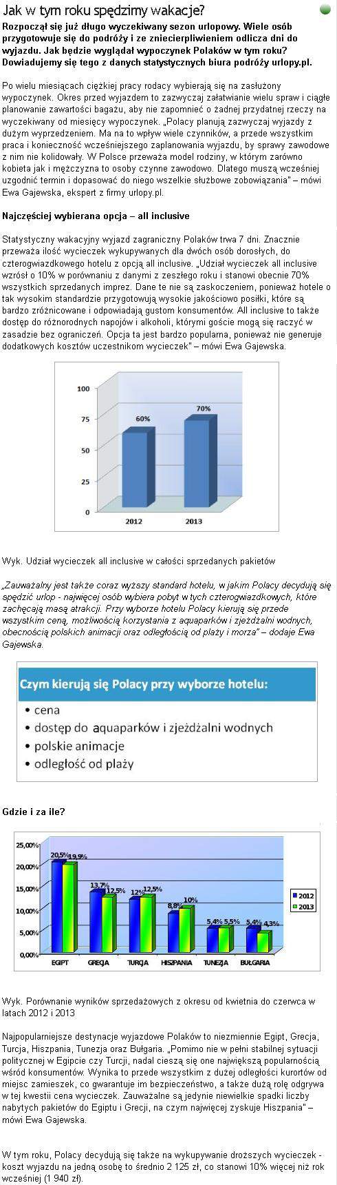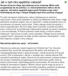 Statystyczny wakacyjny wyjazd trwa 7 dni. Znacznie przeważa ilość wycieczek wykupywanych dla dwóch osób dorosłych, do czterogwiazdkowego hotelu z opcją all inclusive. Udział wycieczek all inclusive wzrósł o 10 proc. w porównaniu z danymi z zeszłego roku i stanowi obecnie 70 proc. wszystkich sprzedanych imprez. Dane te nie są zaskoczeniem, ponieważ hotele o tak wysokim standardzie przygotowują wysokie jakościowo posiłki, które są bardzo zróżnicowane i odpowiadają gustom konsumentów. All inclusive to także dostęp do różnorodnych napojów i alkoholi, którymi goście mogą się raczyć w zasadzie bez ograniczeń. Opcja ta jest bardzo popularna, ponieważ nie generuje dodatkowych kosztów uczestnikom wycieczek – powiedziała Ewa Gajewska z urlopy.pl.