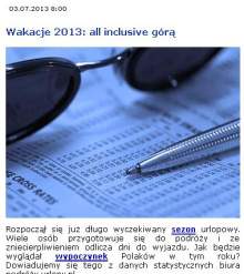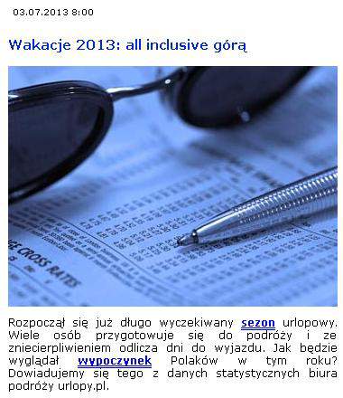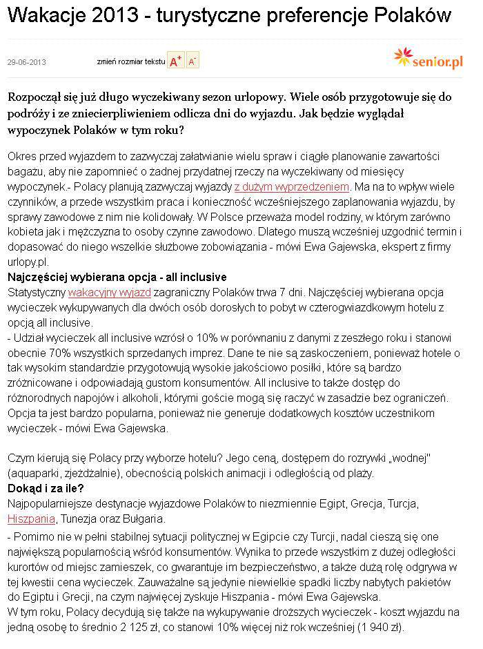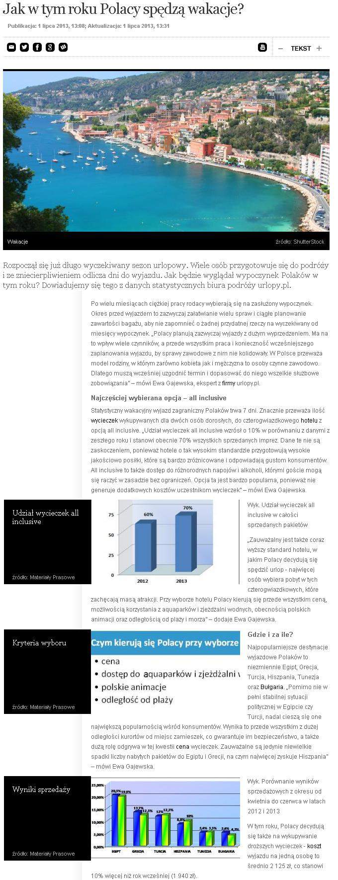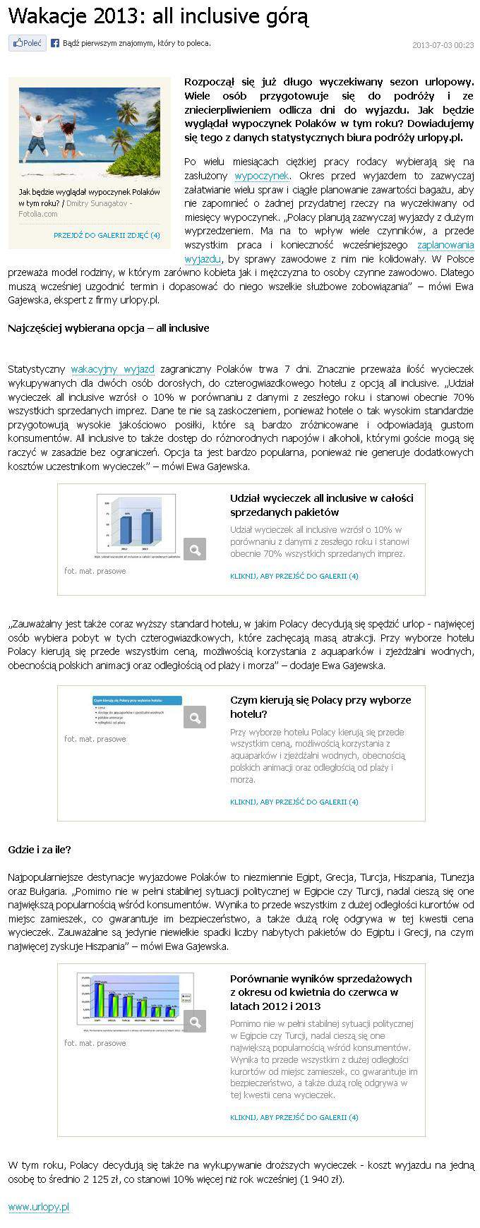 Statystyczny wakacyjny wyjazd trwa 7 dni. Znacznie przeważa ilość wycieczek wykupywanych dla dwóch osób dorosłych, do czterogwiazdkowego hotelu z opcją all inclusive. Udział wycieczek all inclusive wzrósł o 10 proc. w porównaniu z danymi z zeszłego roku i stanowi obecnie 70 proc. wszystkich sprzedanych imprez. Dane te nie są zaskoczeniem, ponieważ hotele o tak wysokim standardzie przygotowują wysokie jakościowo posiłki, które są bardzo zróżnicowane i odpowiadają gustom konsumentów. All inclusive to także dostęp do różnorodnych napojów i alkoholi, którymi goście mogą się raczyć w zasadzie bez ograniczeń. Opcja ta jest bardzo popularna, ponieważ nie generuje dodatkowych kosztów uczestnikom wycieczek – powiedziała Ewa Gajewska z urlopy.pl.