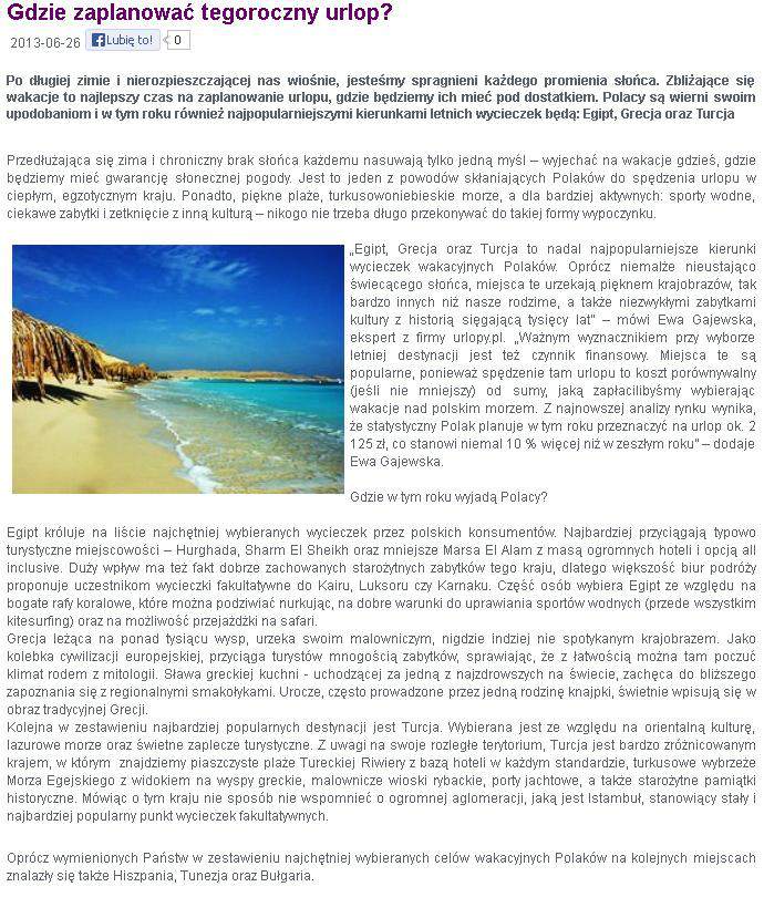 Wyk. Porównanie wyników sprzedażowych z okresu od kwietnia do czerwca w latach 2012 i 2013 W tym roku, klienci urlopy.pl decydują się także na wykupywanie droższych wycieczek – koszt wyjazdu na jedną osobę to średnio 2 125 zł, co stanowi 10 proc. więcej niż rok wcześniej (1 940 zł). Urlopy.pl to biuro podróży, które od grudnia 2007 prowadzi sprzedaż usług turystycznych w zakresie wyjazdów wakacyjnych, wczasów, miejsc hotelowych oraz biletów lotniczych. Firma sprzedające swoje usługi zarówno za pośrednictwem własnych punktów sprzedaży jak i w internecie. Spółka jest notowana na giełdzie New Connect. Źródło: businesstraveller.pl |
