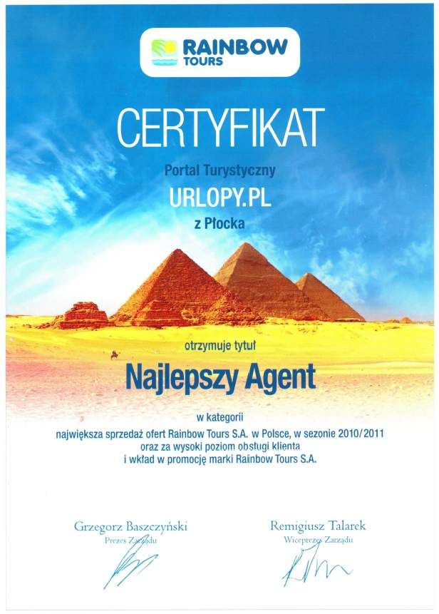 Portal Turystyczny Urlopy.pl z Płocka otrzymuje tytuł Najlepszy Agent w kategorii największa sprzedaż ofert Rainbow Tours S.A. w Polsce w sezonie 2010/2011 oraz za wysoki poziom obsługi Klienta i wkład w promocję marki Rainbow Tours S.A. |