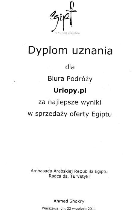 Dyplom uznania dla Biura Podróży Urlopy.pl za najlepsze wyniki w sprzedaży oferty Egiptu.